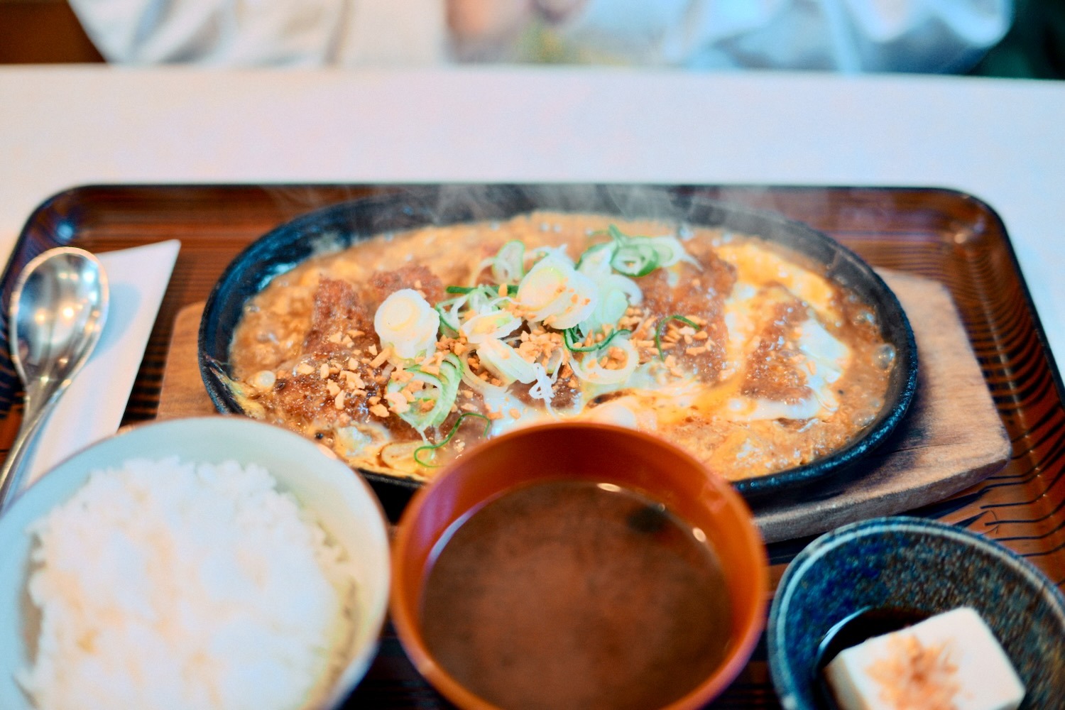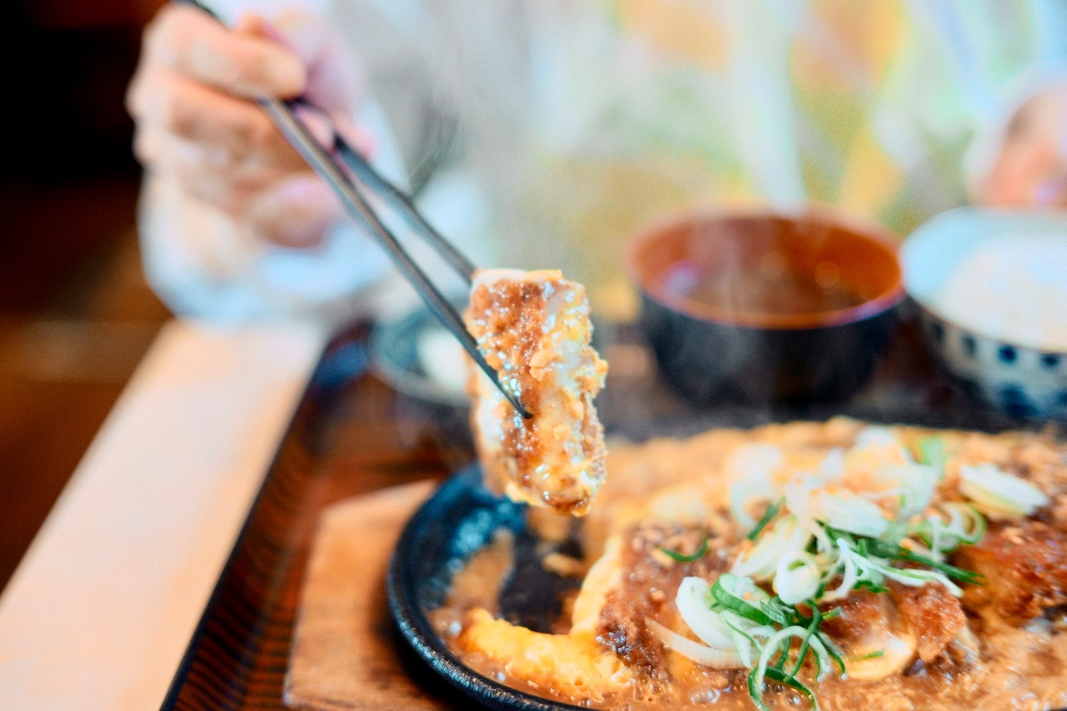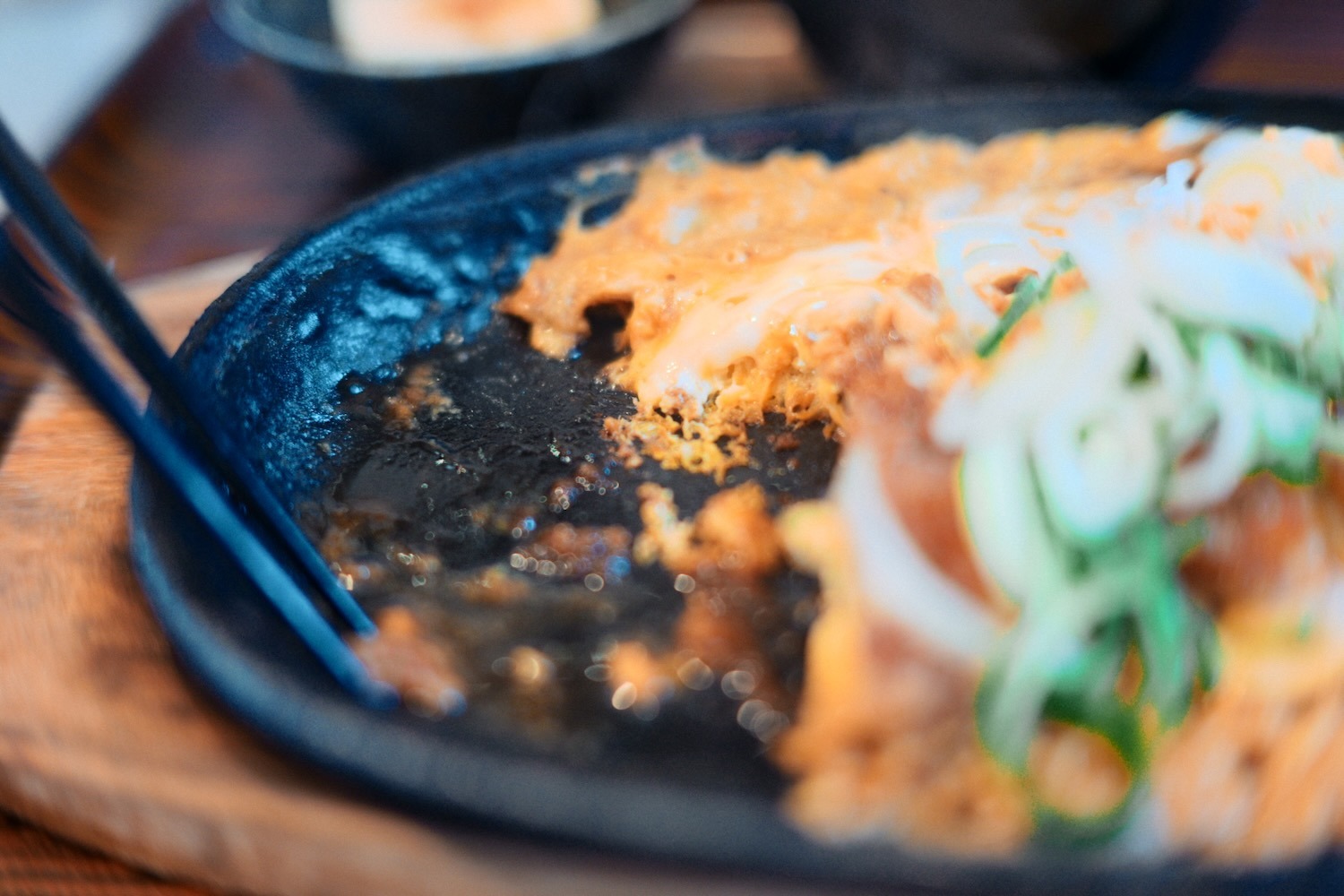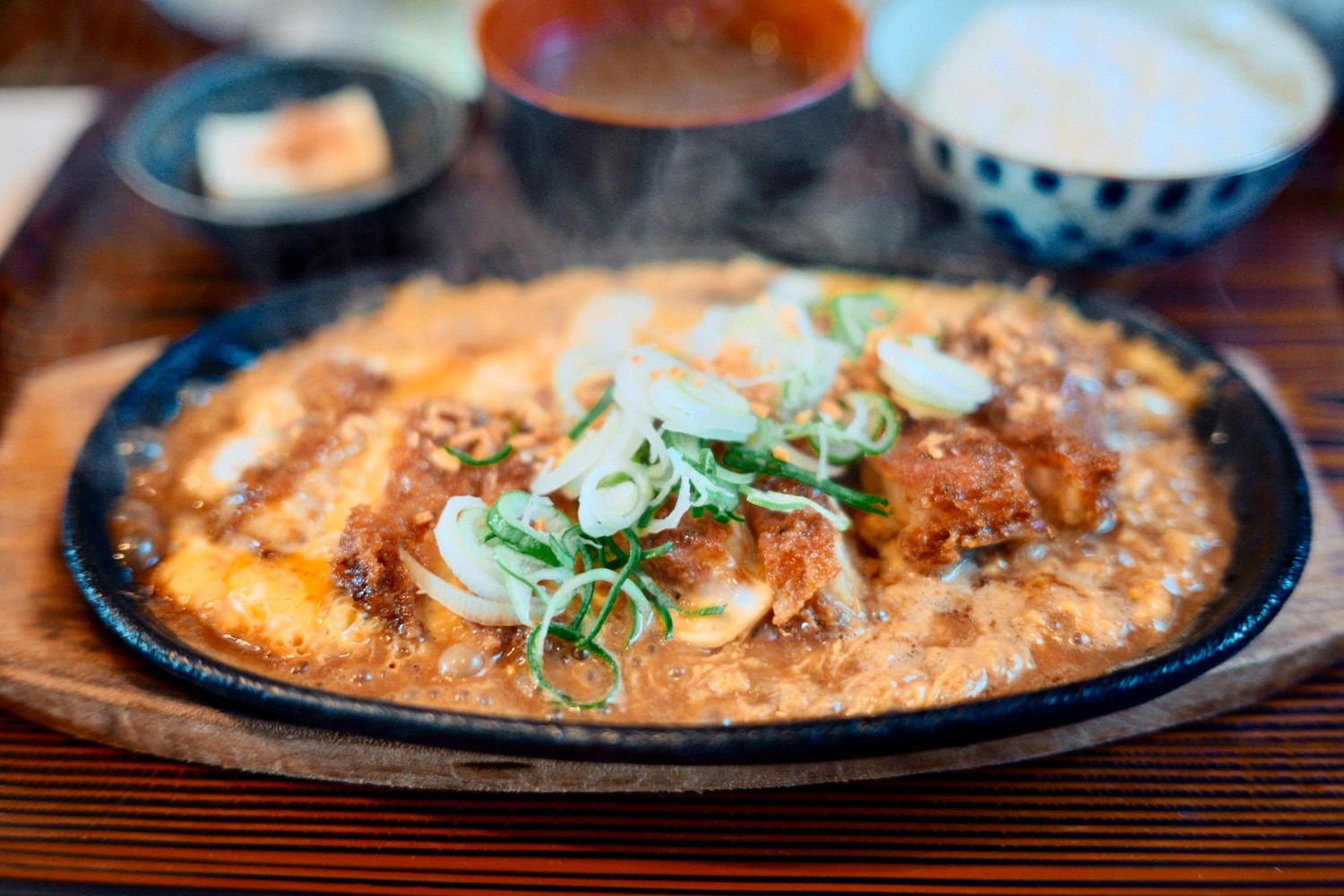 熱々の鉄板に、ガーリック味のソースがかかったトンカツの卵とじ、