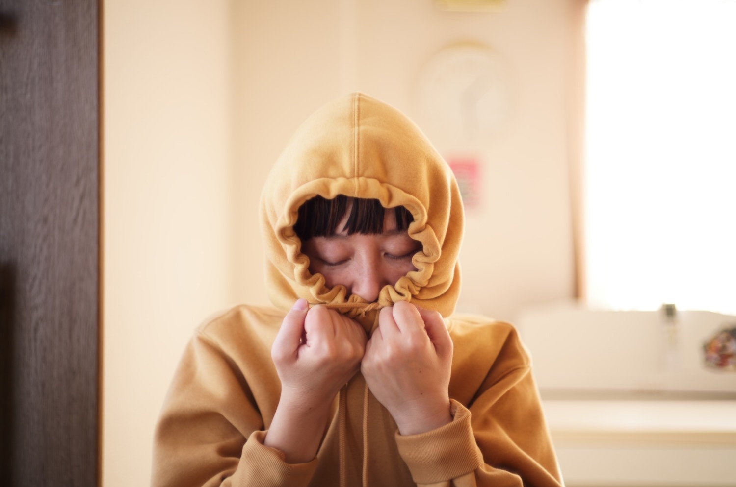 フードをかぶると集中できるのかな。