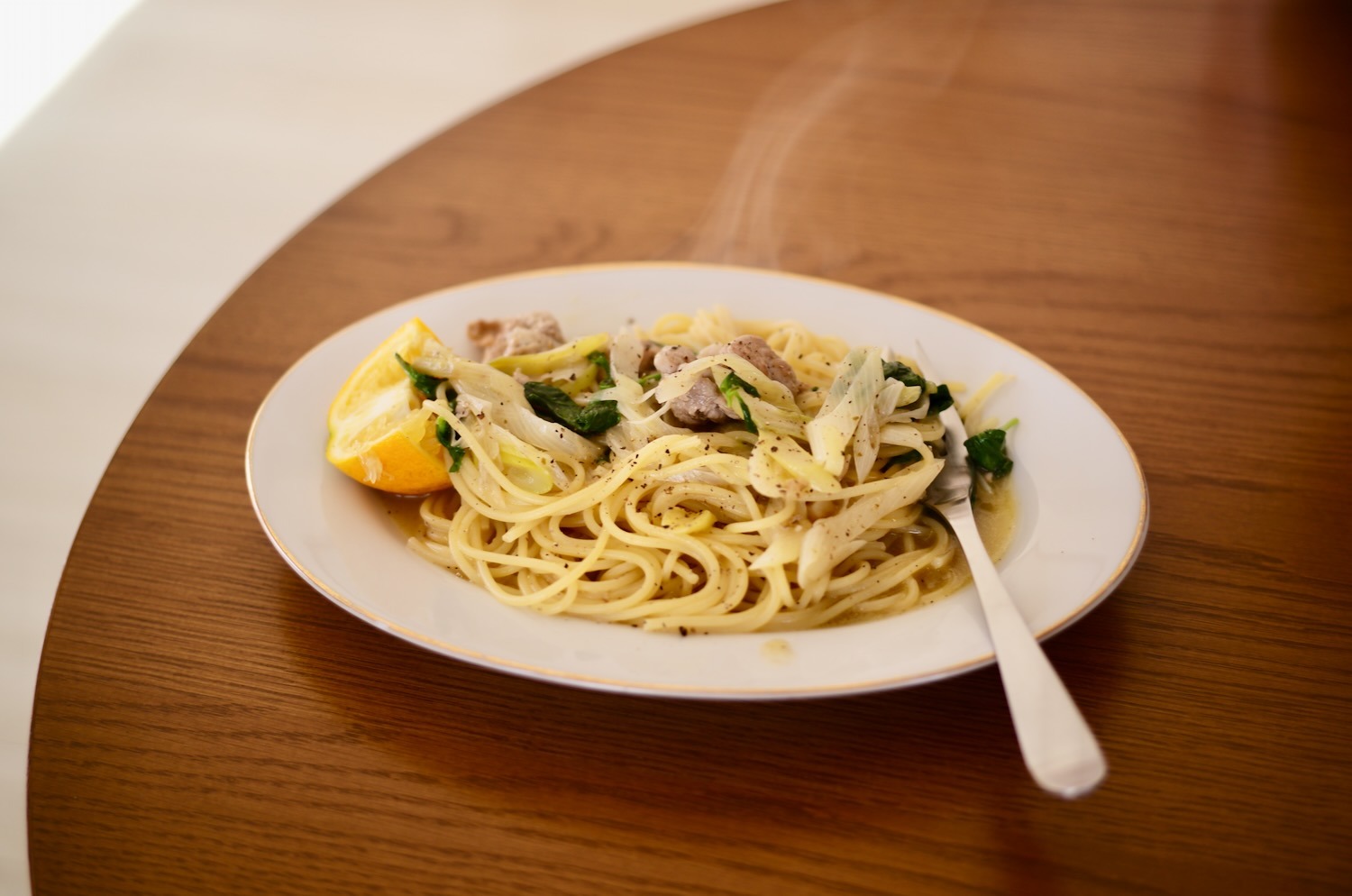 今日のお昼ごはんは豚肉とネギとバジルのレモンパスタ。うまい!