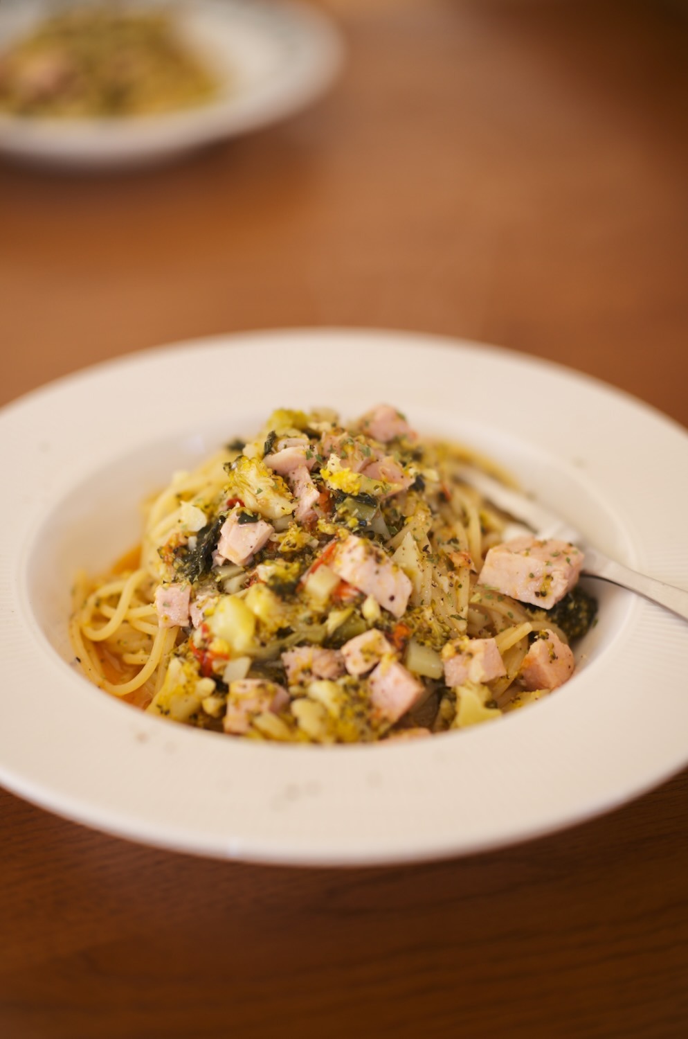 お昼ごはんはブロッコリーとハムのパスタ。