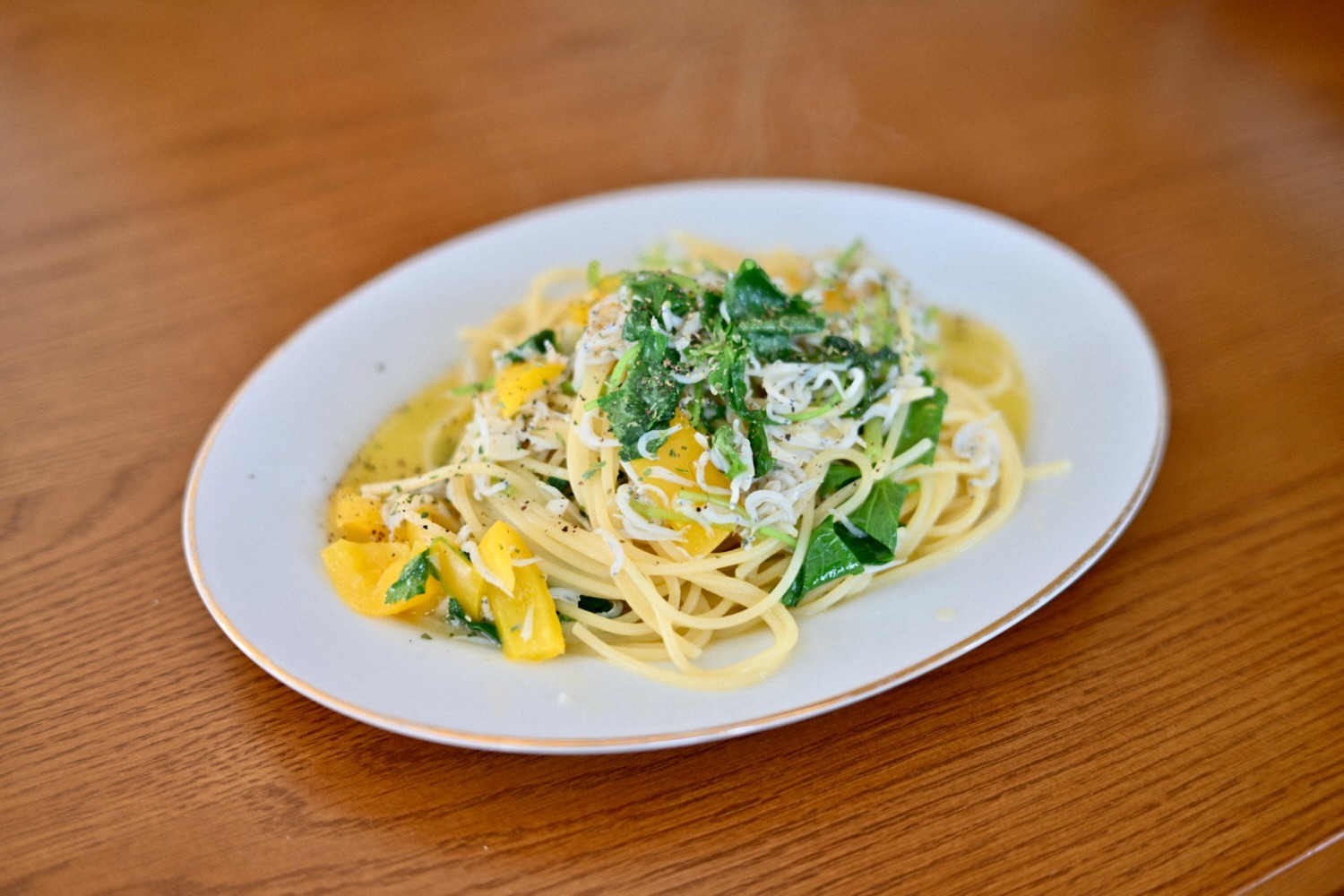しらすとパプリカと三つ葉のワンパンペペロンチーノ。