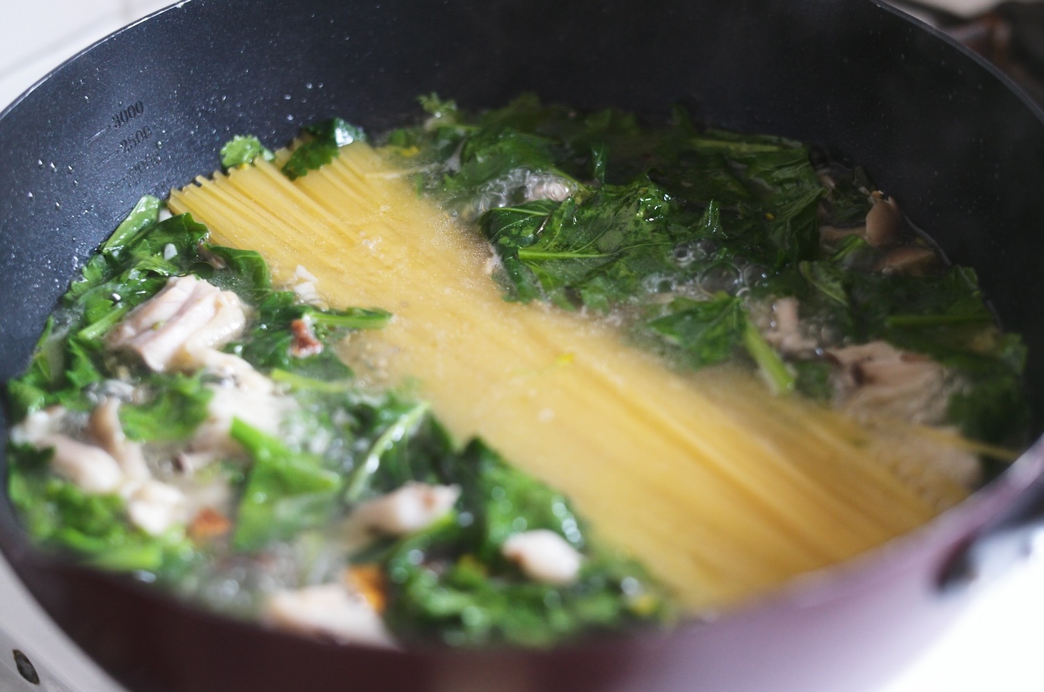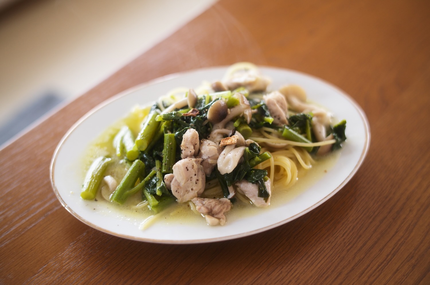 チキンと京ラフランのワンパンパスタ。