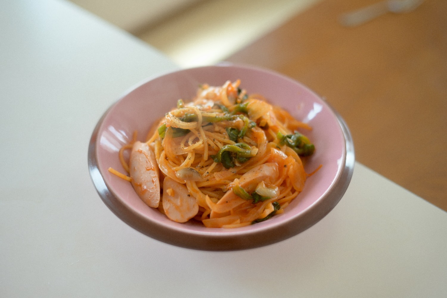 お昼は冷蔵庫の在庫一掃でナポリタン。