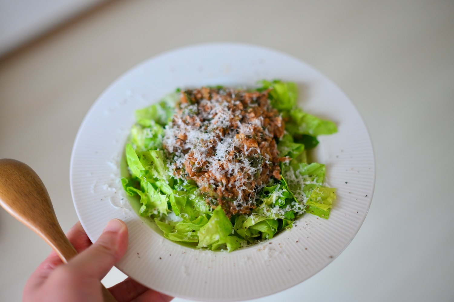 夜ごはんは肉味噌サラダ丼。