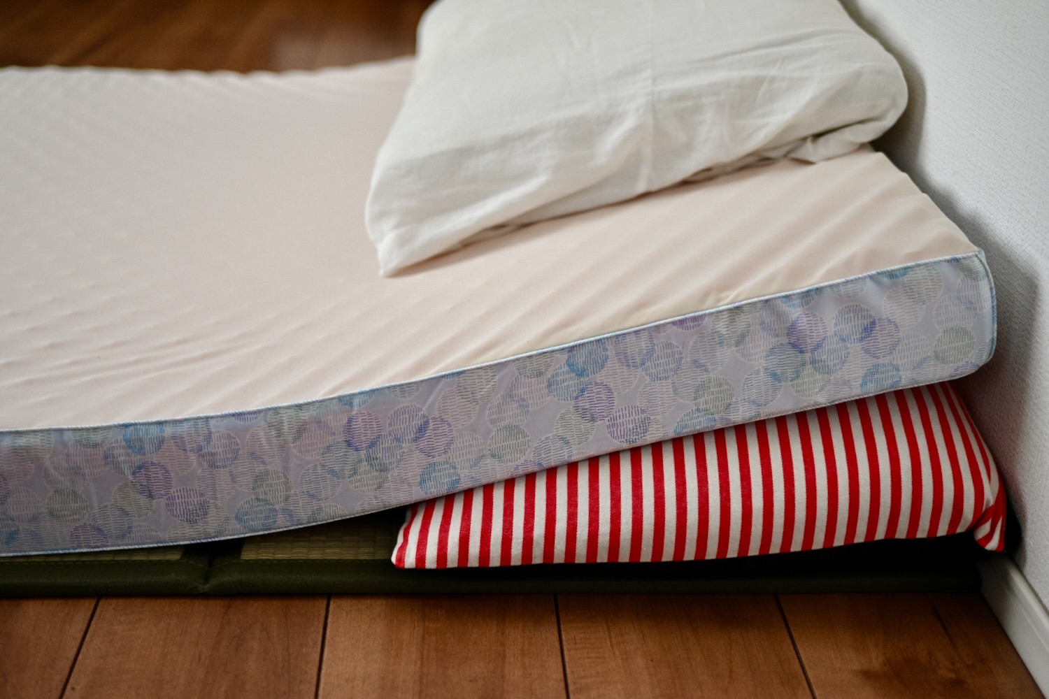 フローリングに畳、その上に枕1つ目、敷きふとん、さらに枕2個目。