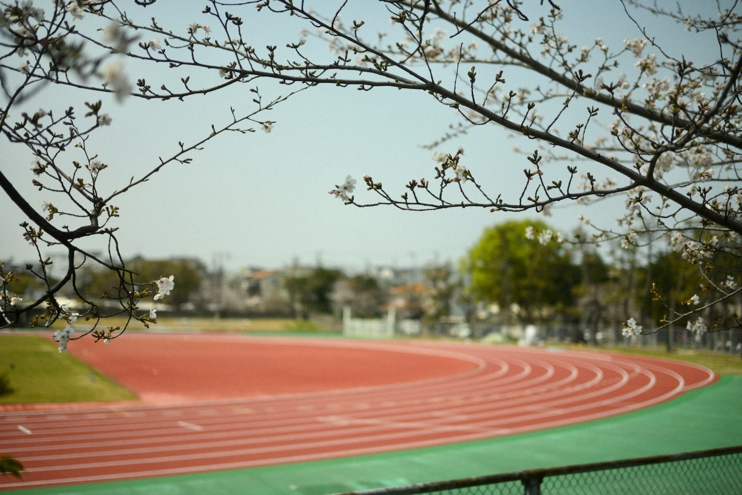 陸上競技場と桜。